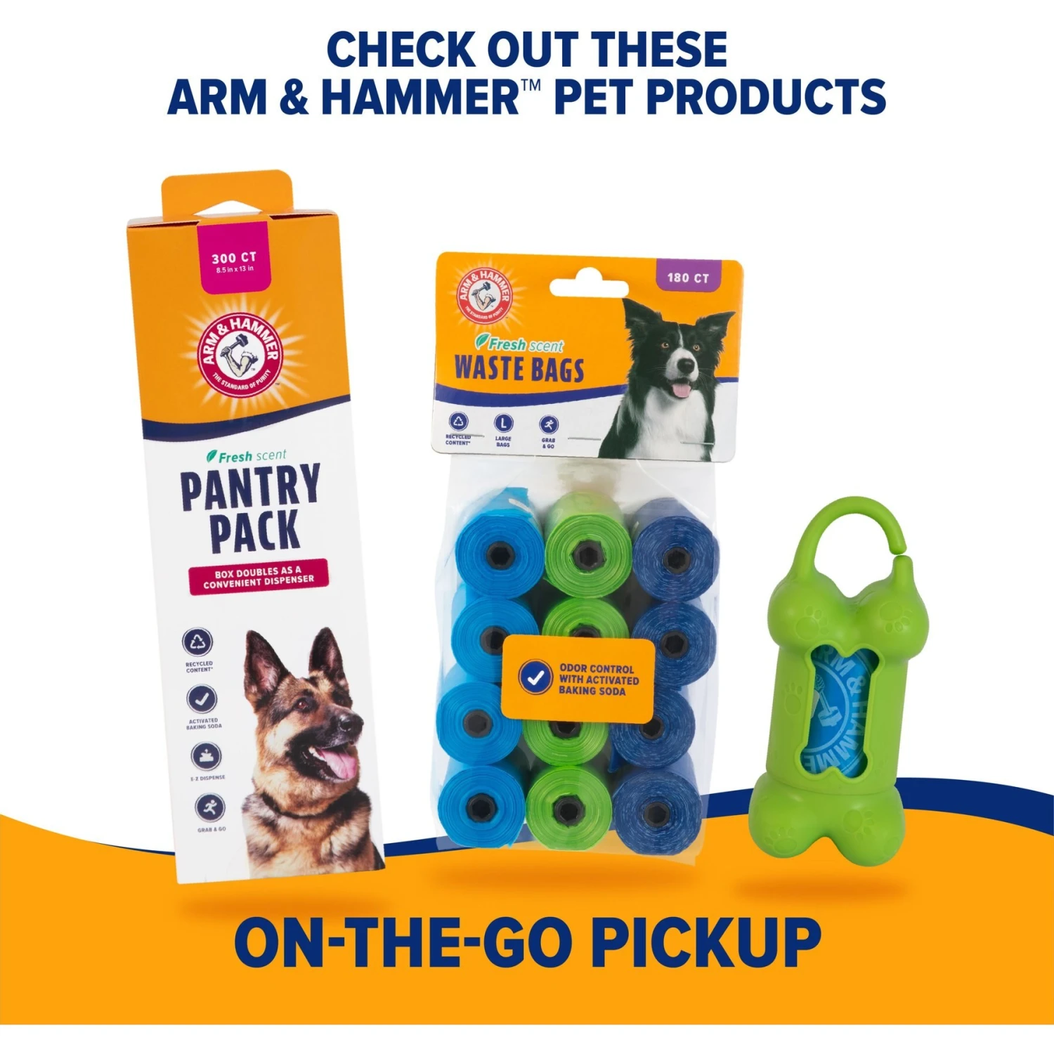 - Two bonus waste bags included that are infused with activated baking soda to neutralize odors and leave a fresh scent. Compatible with Arm & Hammer heavy duty waste bags.