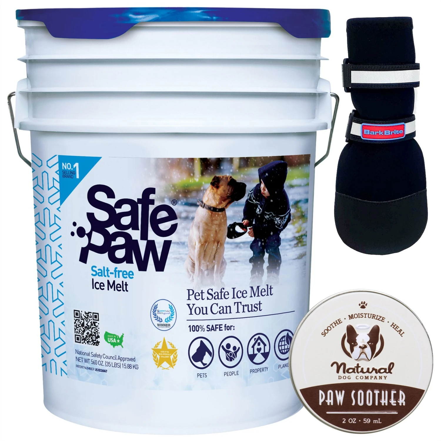 Safe Paw PetSafe Ice Melt for Dogs & Cats, 35-lb pail — Safe Paw PetSafe Ice Melt for Dogs & Cats offers an innovative way to clear your driveways and sidewalks of winter snow and ice. While most ice melters contain salt, which can harm pets, humans, and the environment, Safe Paw is completely salt-free and recommended by veterinarians. It uses a patented, dual-effect compound that works with a two-way timed-released action. First, it starts melting the ice instantly while breaking up the surface tension, and then it penetrates and destabilizes the ice to speed up melting—all while offering slip protection with a proprietary traction agent.