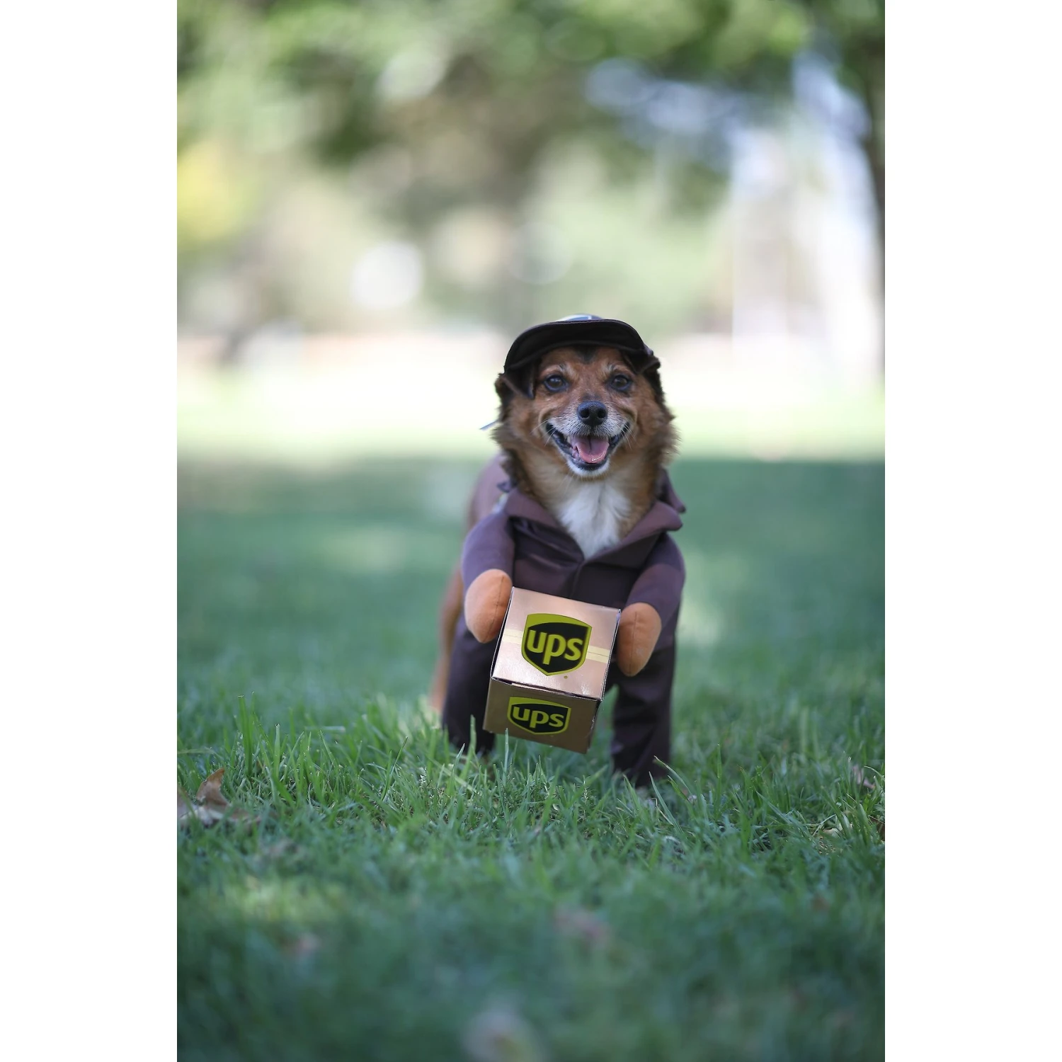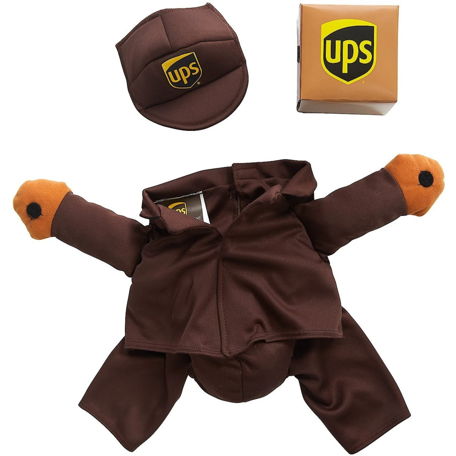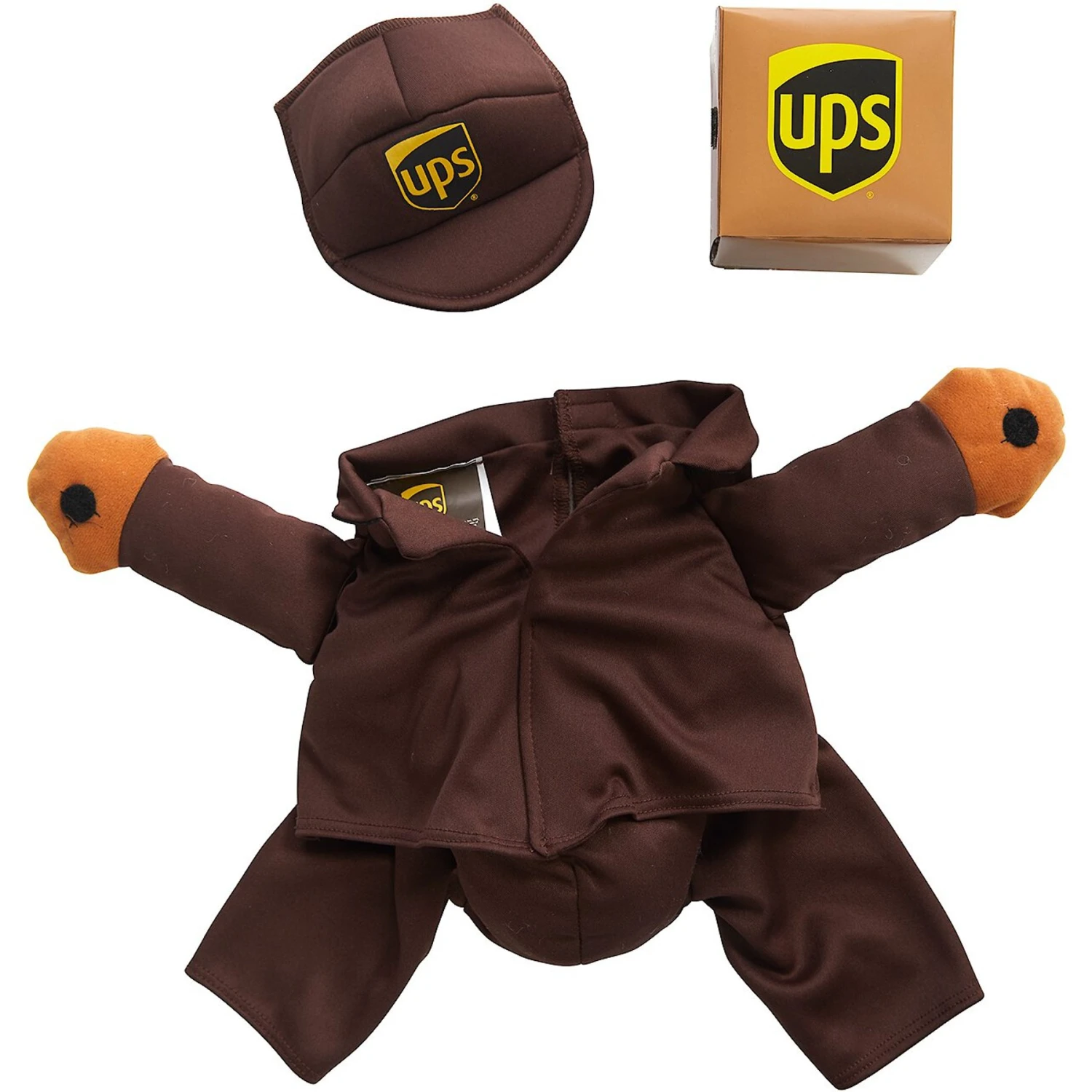 Remember to measure your pet for the paw-fect fit. Your canine or feline courier will deliver the goods when he’s dressed in the California Costumes UPS Delivery Driver Dog & Cat Costume. This unique, high-quality pet costume is officially-licensed by UPS, so it features authentic company brand logos on the included shirt, cap and box. Stuffed arms with fuzzy fastener on the palms of the hands help hold the detachable box in place. The shirt also features a convenient fuzzy fastener closure to easily take it on and off your furry friend. This cute outfit is made of 100% polyester and is perfect for a photo shoot, a pet parade or Halloween dress-up.