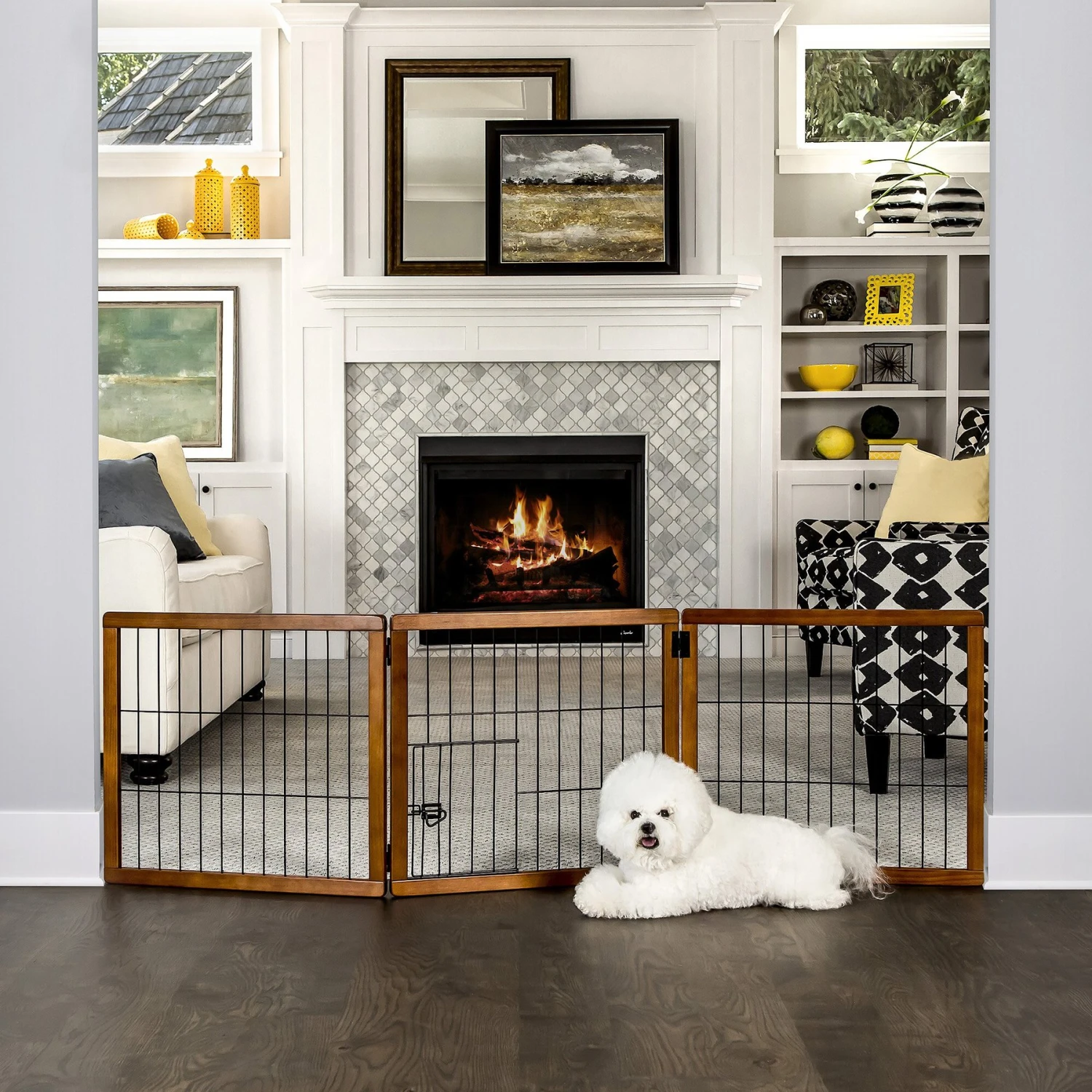 Perfect for when those little dogies need to get along somewhere specific, this Carlson Pet Products 20-in Freestanding Dog Gate can easily corral your small breed dogs where you want them. Easy and quick setup makes this trifold gate an essential tool for protecting both your canine companions and your home itself. Just 20 inches tall and foldable for easy storage, the gate is constructed from New Zealand pine and steel and is equipped with a small pet door to allow your dog to pass when you want them to.