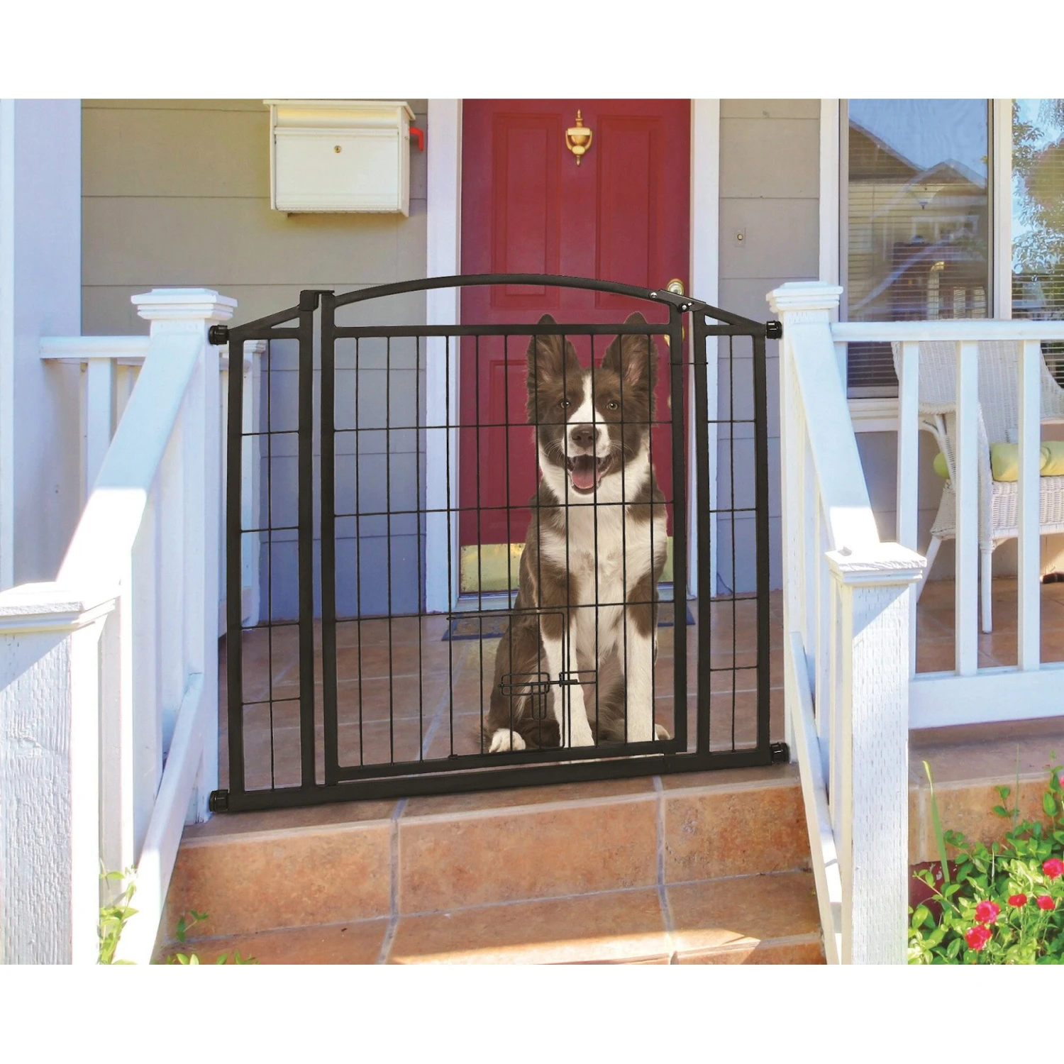 Keep porch pooches safe and happy with the Carlson Pet Products Weatherproof Outdoor Walk-Thru Pet Gate, Black. This sturdy, weatherproof gate works great for securing pups on outdoor porches. The all-steel gate fits in any opening from 29-42 inches wide with the easy-install no-damage pressure mounts. It features a convenient walk-through design with a double lock lever handle and a 10 X 7-inch door for smaller animals. Mount it at the top or bottom of the porch stairs or even in your front doorway so your canine can catch a breeze!