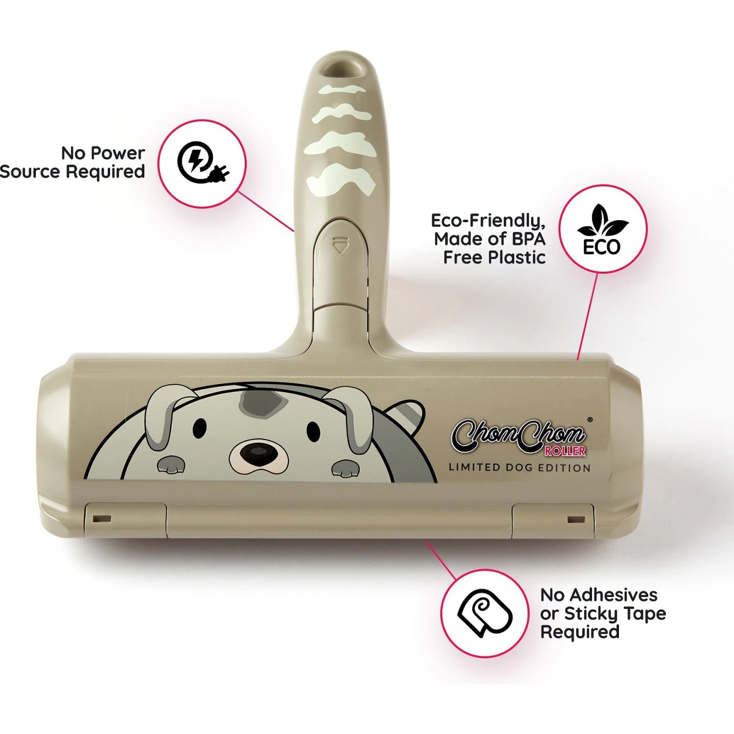 Reclaim the couch with the ChomChom Roller Limited Dog Edition Pet Hair Remover! This fur-tastic roller effortlessly sweeps away stray hair deeply embedded in furniture such as chairs, beds and couches. Simply sweep the roller back and forth and watch as the electrostatic charge immediately attracts pet hair to the roller, no more sticky lint rollers or noisy vacuum cleaners! Plus, this clever pet hair catcher is 100% reusable and requires no power source, so you can feel great about doing your part to save the environment while also saving money in the long run. Plus, limited edition ChomChom Roller has a cute doggie design on it!