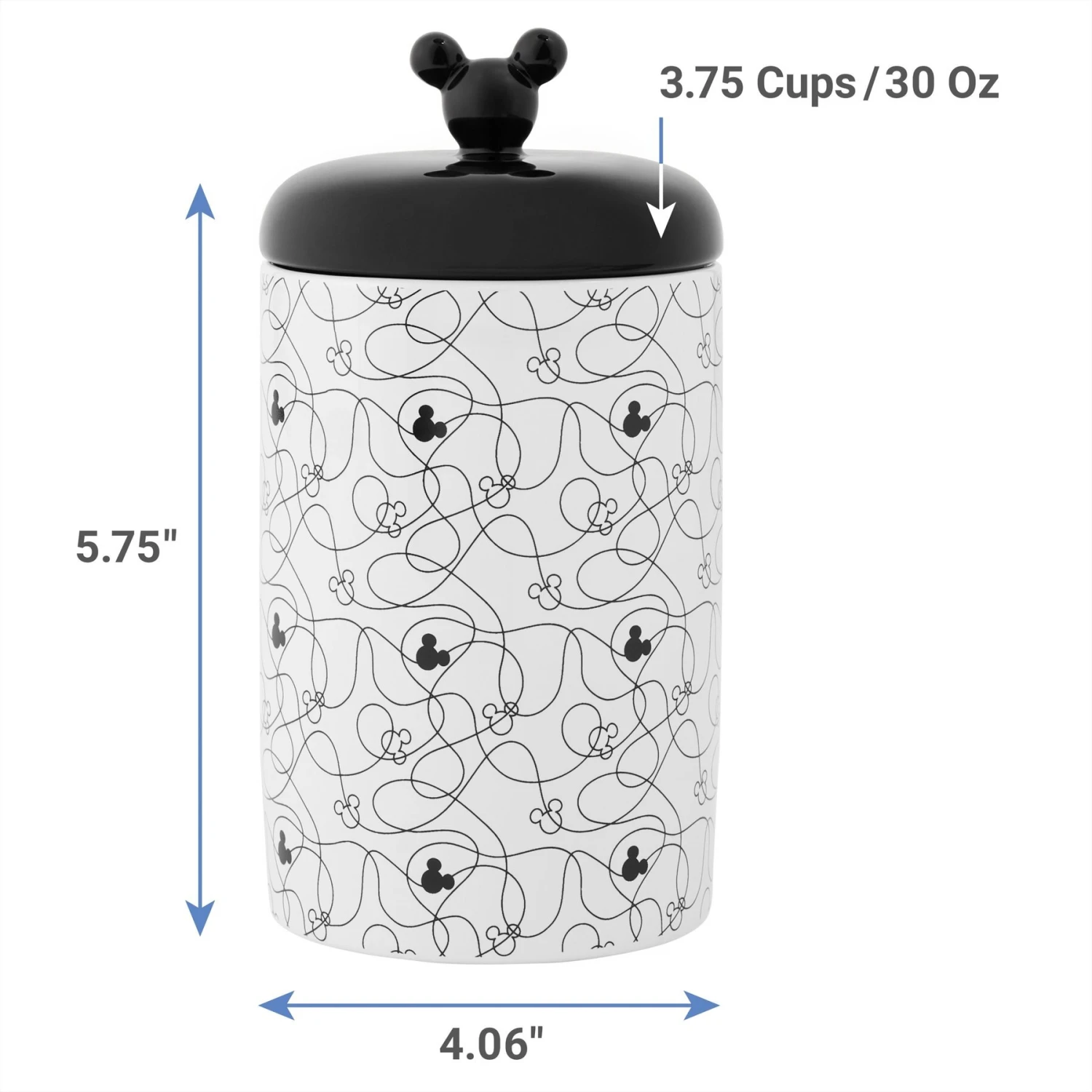 - Cute treat jar with a modern, black-and-white Mickey-themed design.