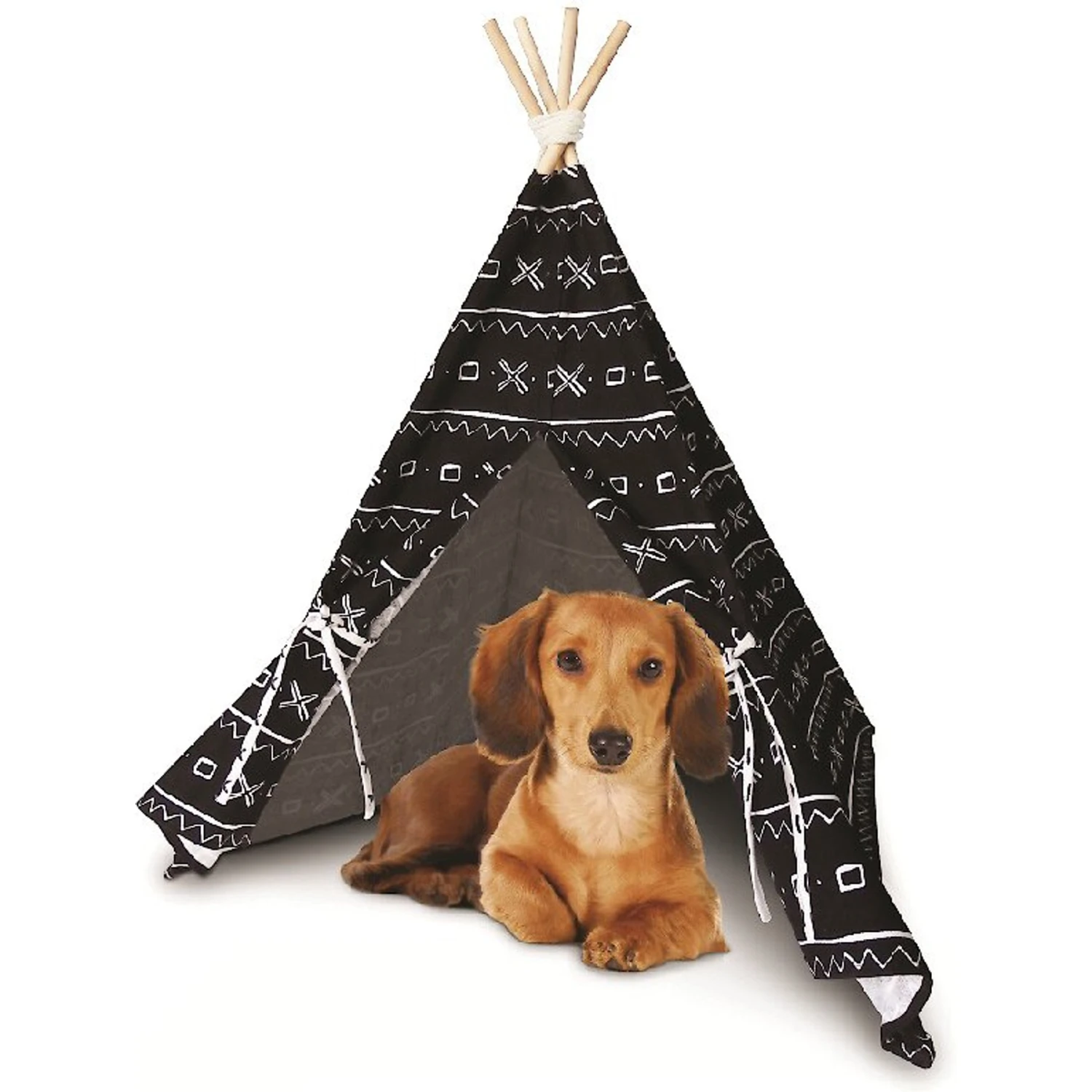 This Dog Whisperer Mudcloth Pet Teepee House is a unique hideaway your four-legged friend will love to lounge in! The built-in wood poles are easy to assemble and it collapses when needed with ease for simple, compact travel and storage. Dogs and cats alike love taking some me-time in this stylish take on a pet tent. Made from 100% polyester, the stunning mudcloth covering is completely machine washable so you can keep it pristine for years to come.