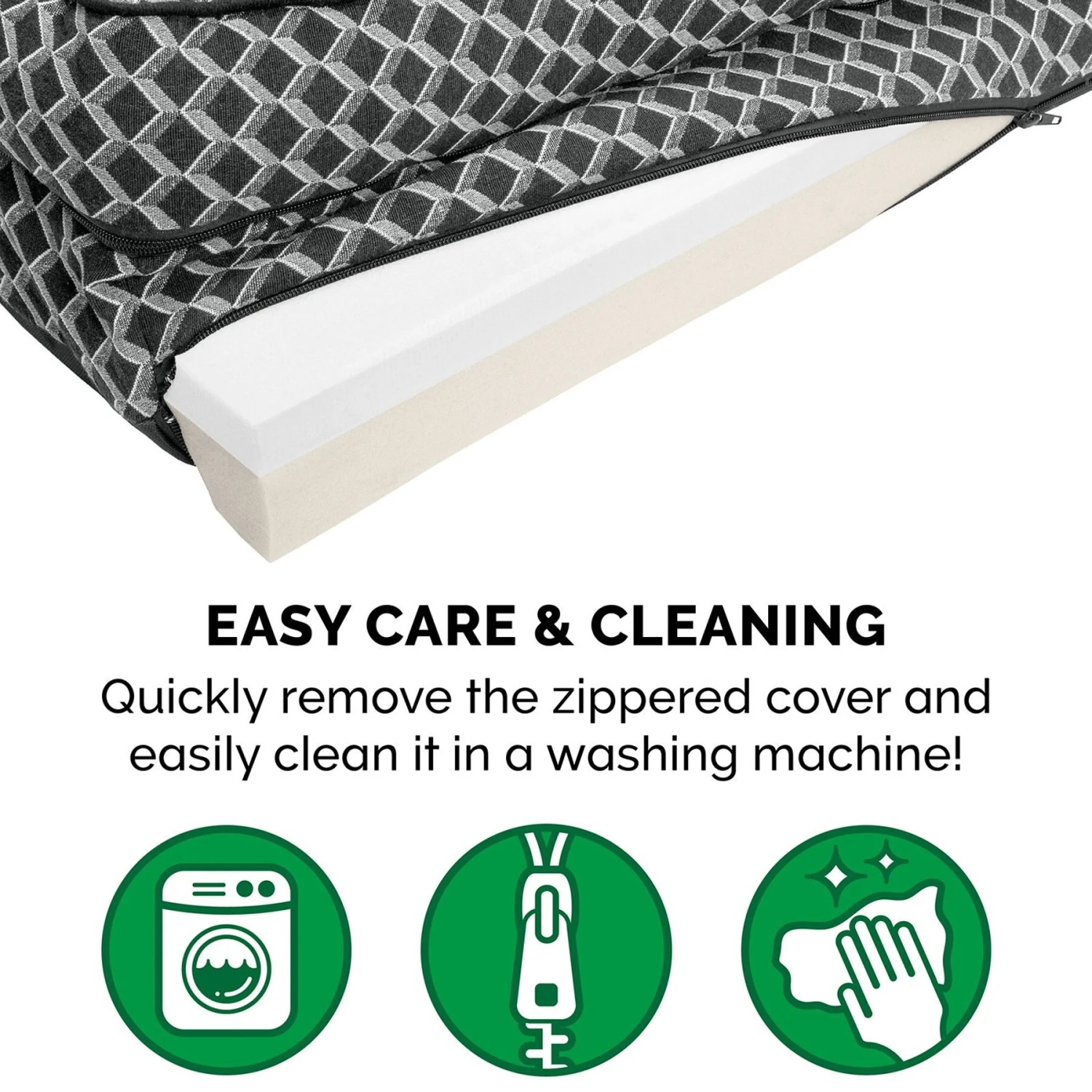 - Includes a zippered, removable cover that is machine washable.