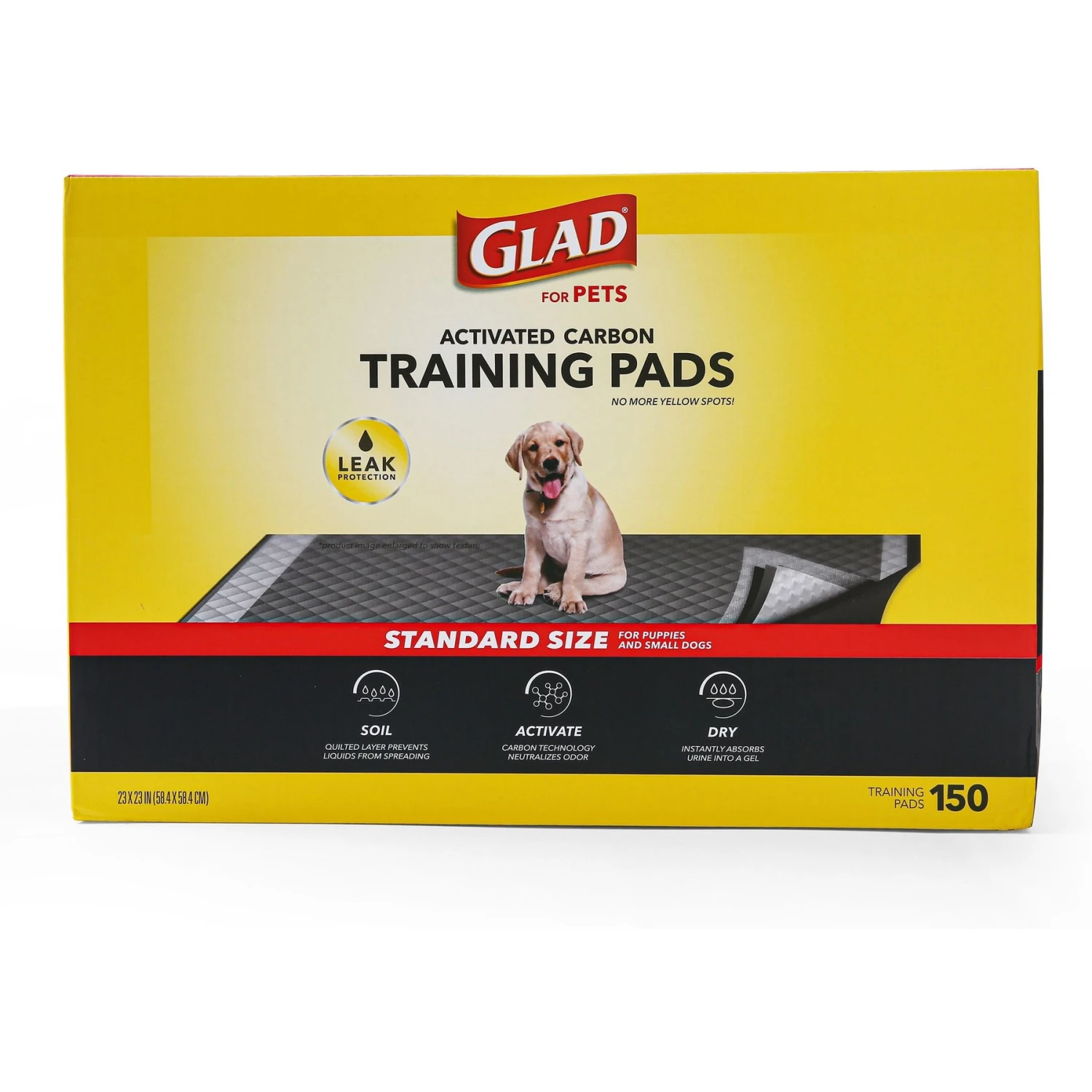 Glad For Pets Activated Carbon Dog Training Pads offer potty pads with a name you trust. These carbon-activated pads are made with five layers of Glad-level strength for leak-proof protection and odor neutralization. The quilted technology works to lock in up to three cups of liquid, preventing spreading and stains, while the polymer layer turns the liquid into gel. The activated carbon layer is designed to absorb all odor and yellow spots, leaving nothing but an easy-to-toss pad behind. These pads are perfect for training puppies or new dogs, helping out senior dogs, or even lining your crate or carrier.