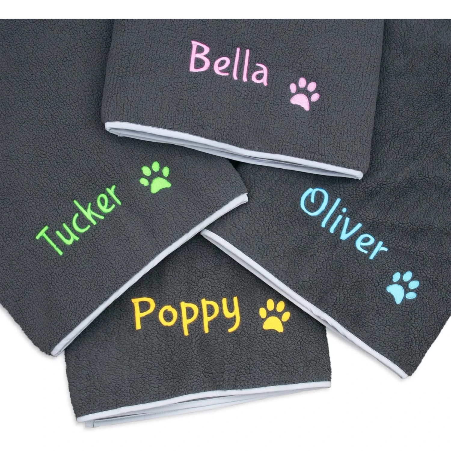 Give your best bud a special possession with the GoTags Personalized Dog Blanket. This personalized blanket is made of cozy fleece for maximum comfort and is paw-fect for the couch, bed, car, or beach–the moisture-resistant backing keeps wetness where it belongs. Plus, it can be custom embroidered with your pet’s name and a paw print in your color of choice!