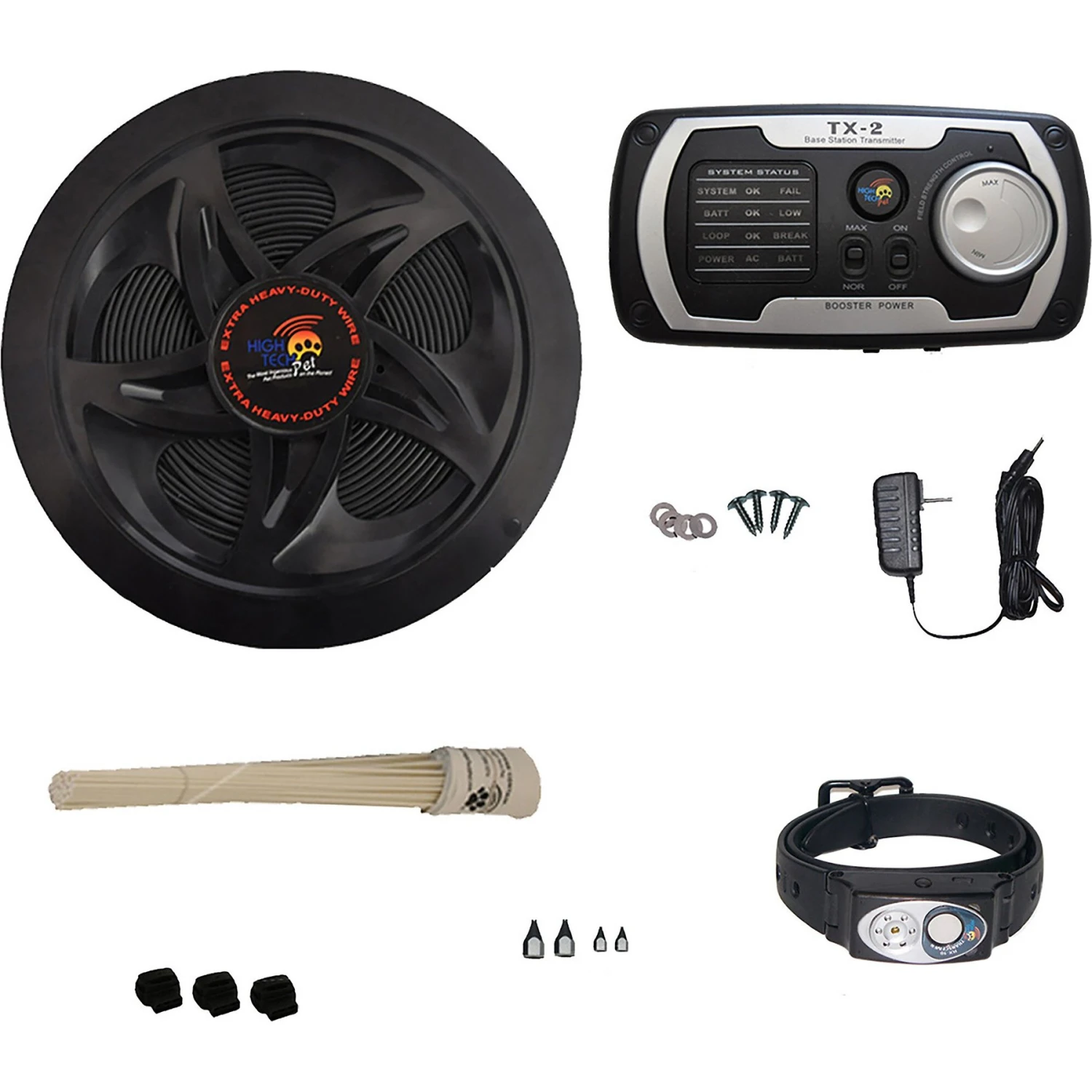 TX-2 Transmitter, RX-10 Multi-Function Collar, Collar Charger, (500) feet of Ultra-Wire, (50) Boundary Flags, (3) Wire Splices, AC Adapter for Transmitter & AC Adapter for Charger.