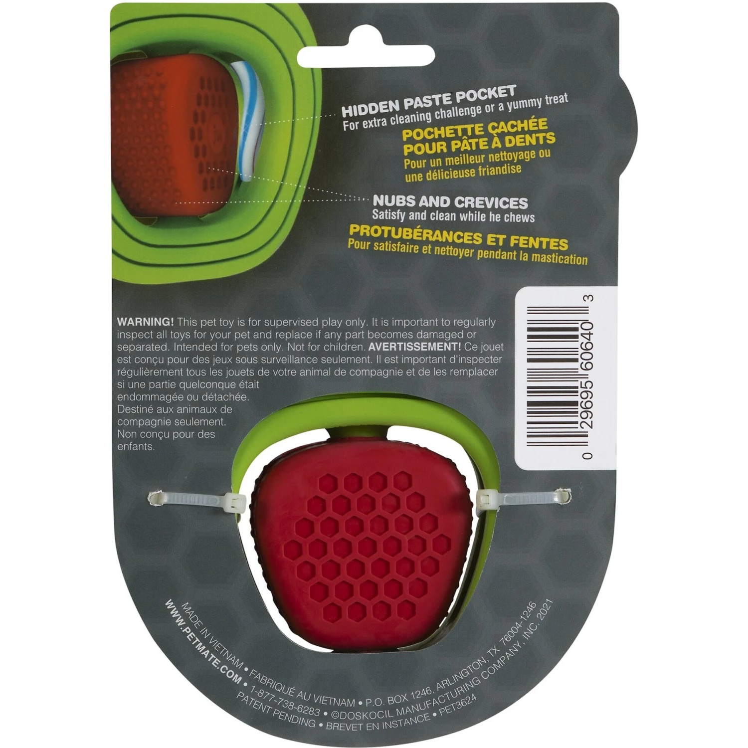 Help clean your precious pooch’s teeth without brandishing the scary toothbrush with the JW Apple Core Chew-ee Dog Toy. Covered in cleansing nubs, crevices and grooves, this chewtastic dog toy gently massages your pal’s teeth and gums, which can help improve his dental health and his smelly breath as he satisfies his natural urge to chew. This invigorating chew toy has a red center core that spins as your precious pooch gnaws, which provides him with extra cleaning action. Plus, it has a hidden inner paste pocket that is paw-fect for hiding canine toothpaste or his favorite spreadable treat, which can encourage him to chew and play for hours!