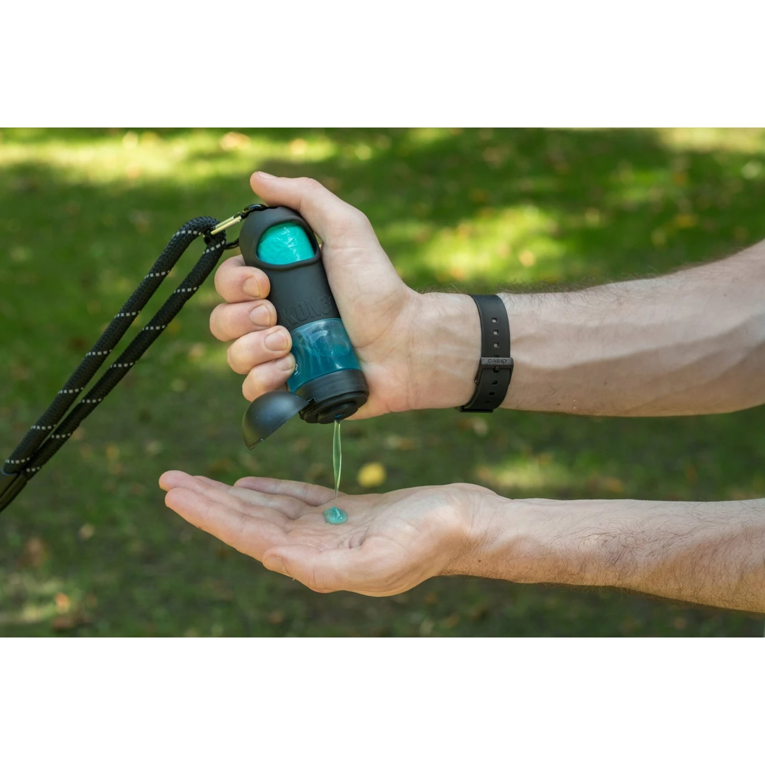 - Poop bag dispenser with 10 starter bags and hand sanitizing gel attachment so everything is ready to grab and go when nature calls.