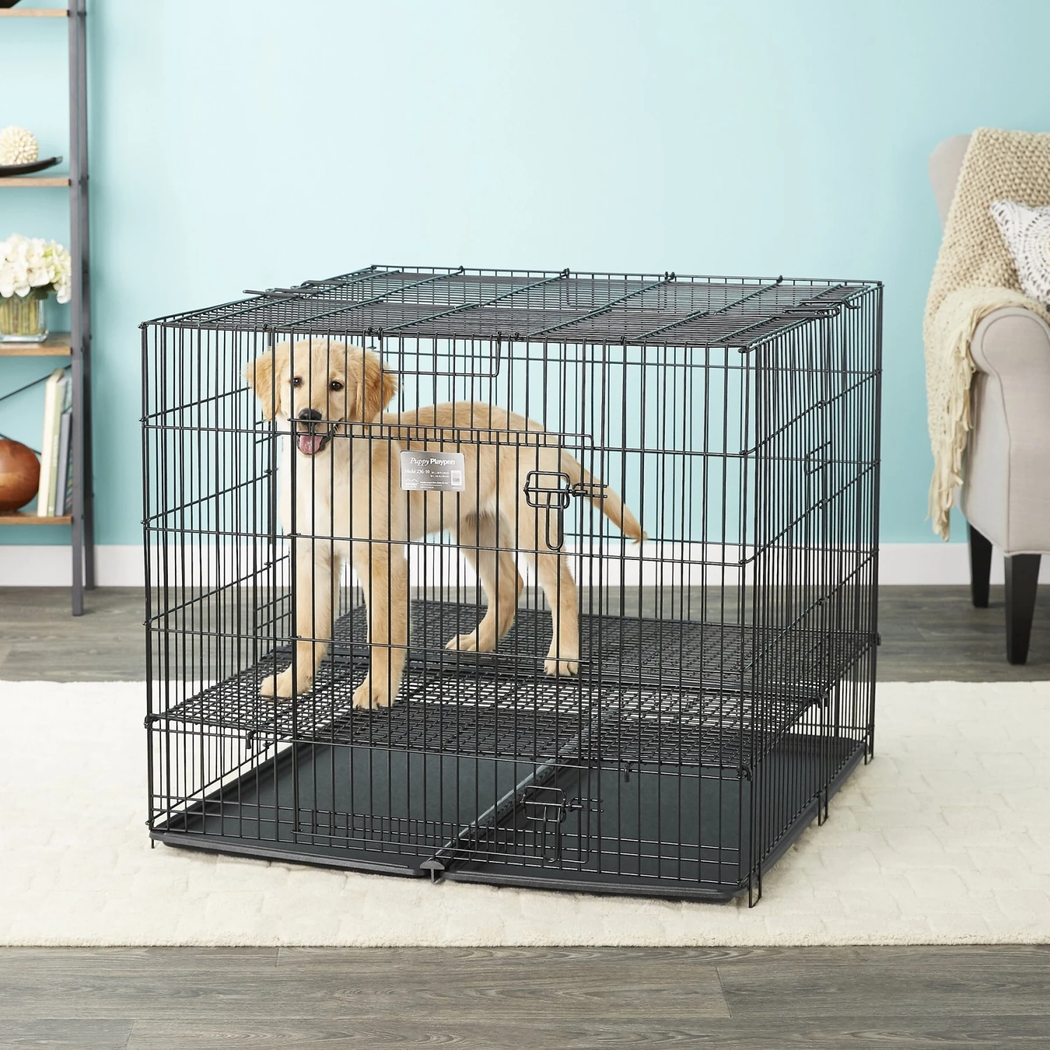 - Each metal puppy playpen dog crate features a durable, rust-resistant e-coat finish for long-lasting use.