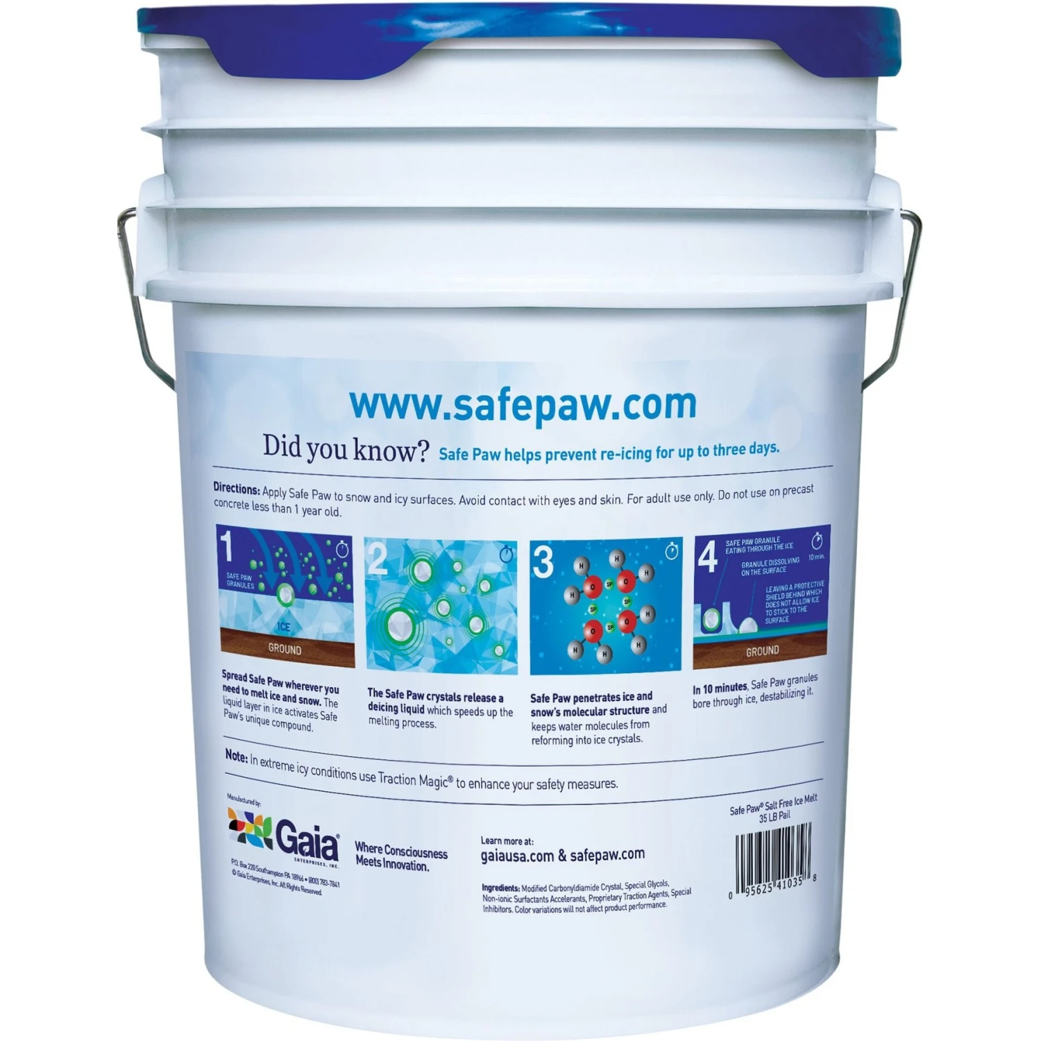 Safe Paw PetSafe Ice Melt for Dogs & Cats, 35-lb pail — Safe Paw PetSafe Ice Melt for Dogs & Cats offers an innovative way to clear your driveways and sidewalks of winter snow and ice. While most ice melters contain salt, which can harm pets, humans, and the environment, Safe Paw is completely salt-free and recommended by veterinarians. It uses a patented, dual-effect compound that works with a two-way timed-released action. First, it starts melting the ice instantly while breaking up the surface tension, and then it penetrates and destabilizes the ice to speed up melting—all while offering slip protection with a proprietary traction agent.
