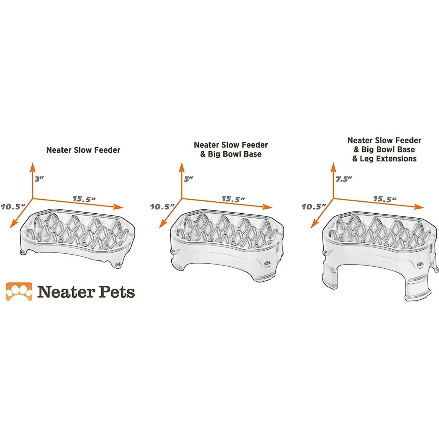 Paw-suade your furry BFF to slow down when she’s eating and serve her meal at the paw-fect height with the Neater Pets Adjustable Slow Feeder Dog & Cat Bowl. Featuring multiple peaks and valleys, your pet won’t be able to gobble up her meal, which will reduce gulping, vomiting, and bloating. Divide food amongst the various pockets to control how big of a mouthful your pet gets. The spaces are wide enough apart and rounded to comfortably accommodate noses of all shapes and sizes — even those with flat faces! Unlike other slow feed bowls, the Neater Slow Feeder lets you customize the height to three different levels to help pooches of all sizes eat from a com-fur-table position. The first level is just using the top part of the feeder by itself and this measures 2 inches high. If you want to raise the feeder up to 3 inches, then attach the base that comes with the feeder. To get the feeder to the tallest position of 4.5 inches, attach the leg extensions to the base. Having an adjustable feeder is great for puppies as it can grow with them! The Neater Slow Feeder also has non-skid rubber feet to keep it in place when your eager eater dives in. Made of food-safe polypropylene, this slow feed bowl is dishwasher safe (you may want to remove rubber feet first to make sure they don’t fall out). Stop scarf and barf today with the Neater Slow Feeder!