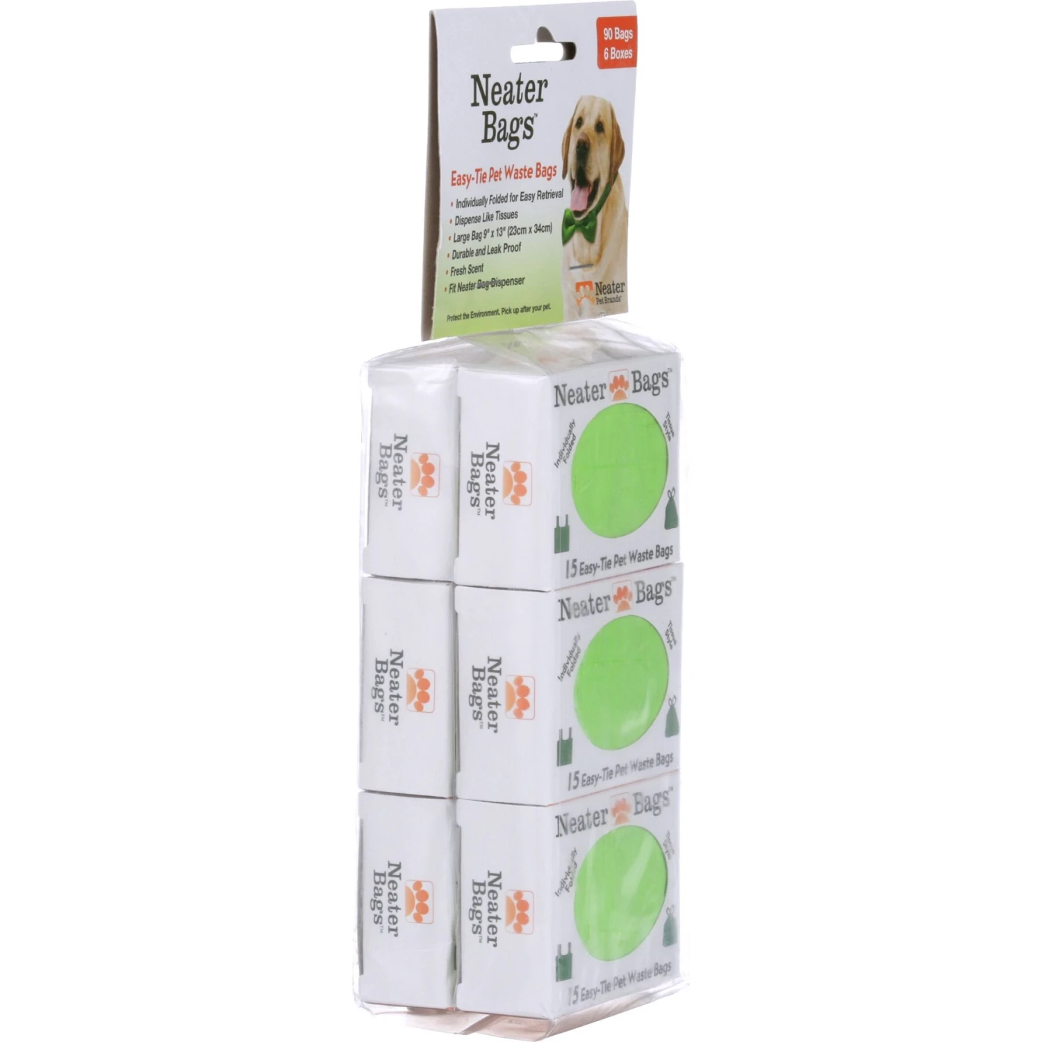Neater Pets Neater Bags Easy-Tie and Tissue-Like Dispensing Pet Waste Bags make picking up after your dog easy and mess-free. These large durable, leak-proof dog poop bags are the perfect solution for disposing of your best buddy’s business during daily walks. They’re individually folded for easy one-at-a-time tissue style dispensing. Simply grab the bag and pull it out of the box like a tissue — no rolls to fuss around with! Bags also have tie handles for easy closure and convenient carrying and they’re lightly scented to help mask odors. Make cleaning up your dog’s poop a little less crappy with the Neater Bags!