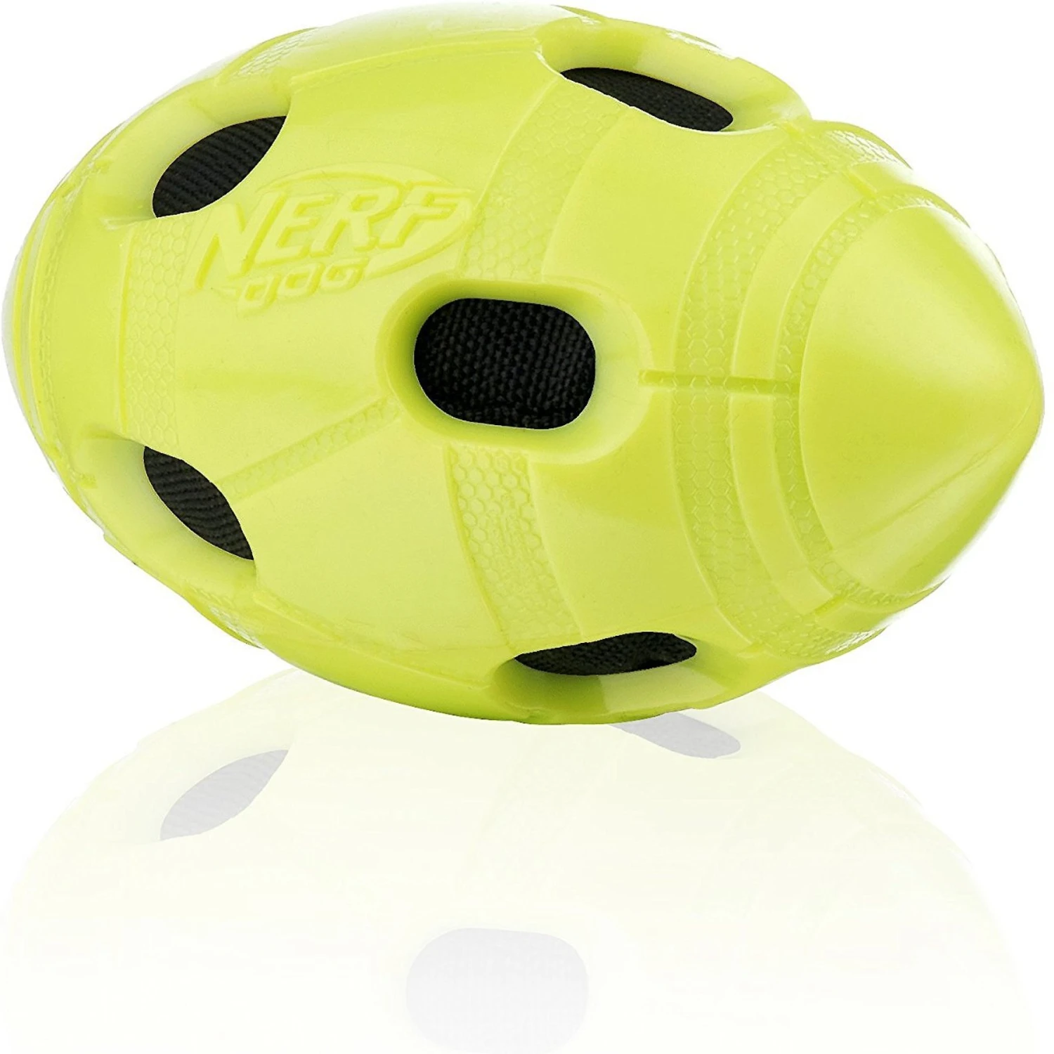 Take your game of fetch to the next level with the innovative Nerf Dog Crunchable Football Dog Toy. This interactive toy has two different exciting textures. Inside is a nylon material with an intriguing center that makes irresistible crunching and squeaking noises when your pup catches it. The rubber exterior gives you a good grip so you can throw the Crunchable Football even farther. At six inches long and four inches wide, it’s just the right size for throwing the perfect spiral. It’s water- and weather-resistant to stand up to water, mud, rain, drool or sweat. And it floats in water, so you can have fun at the beach or in the pool. It’s a crackling, rolling, dog-worthy and overall exciting retrieval toy.