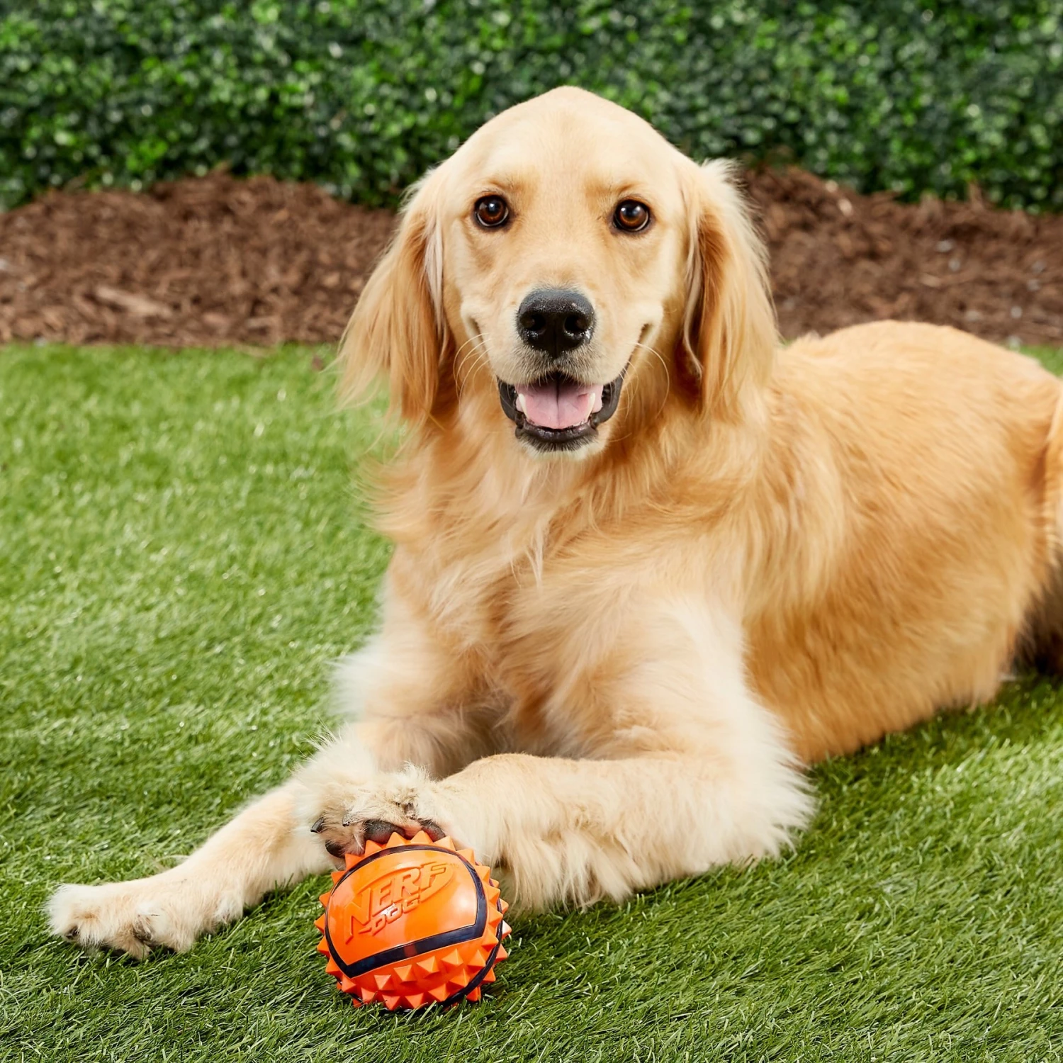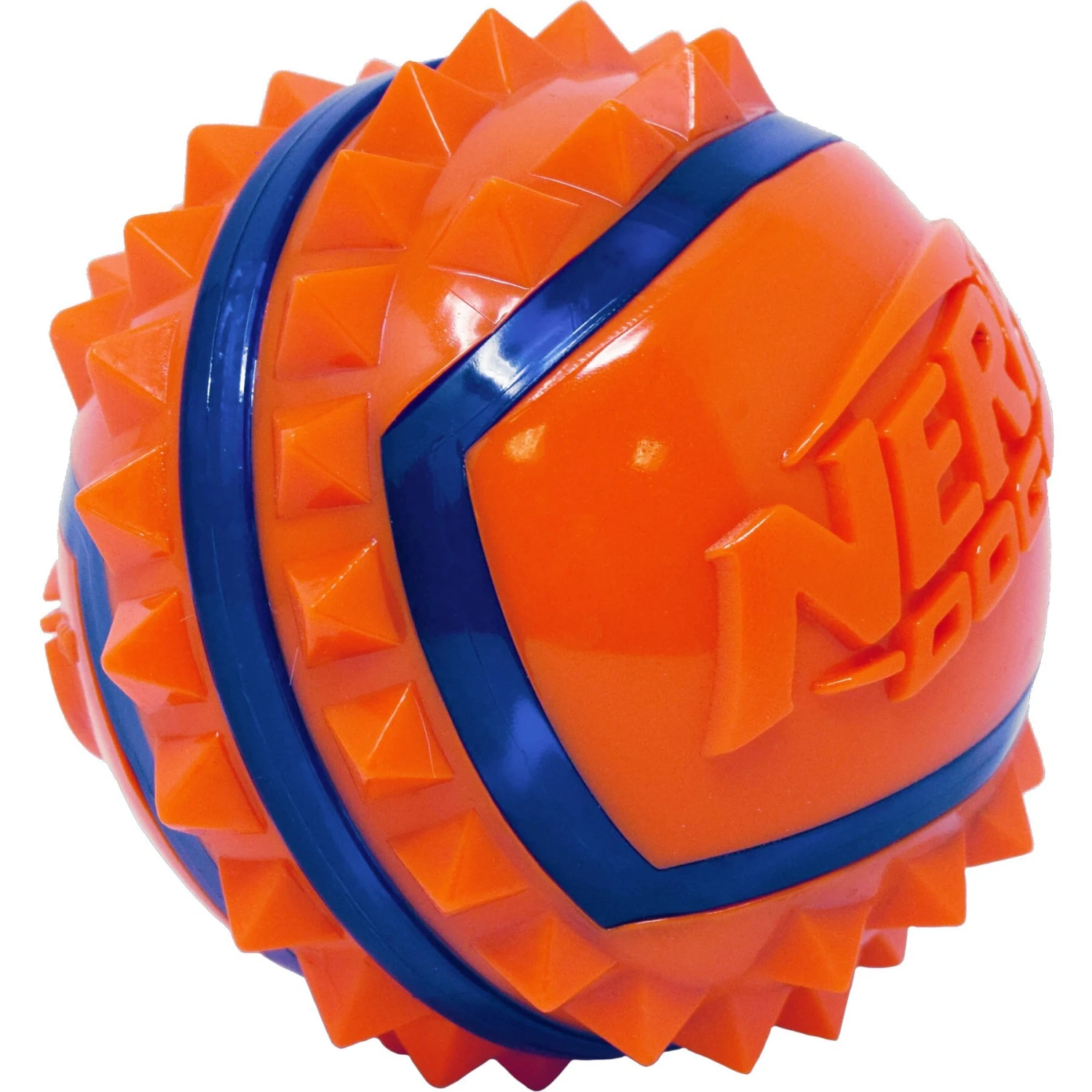 Keep your dog’s teeth healthy and clean with the Nerf Dog TPR Spike Ball Dog Toy. The spiked ridges clean teeth as your dog chews, encouraging healthy chewing habits and good dental health. You can even provide extra enticement by adding a little of your dog’s favorite sticky treat to the toy—like peanut butter, or any liquid treat! Nerf-quality materials allow this toy to be lightweight and durable, plus it’s brightly colored so you and your pet never lose track, no matter where you toss it. The spikey toy is molded in a durable thermoplastic rubber, making it extra strong, so it’ll stand up to extended chewing, and textured ridges make it great for toss and fetch, too.