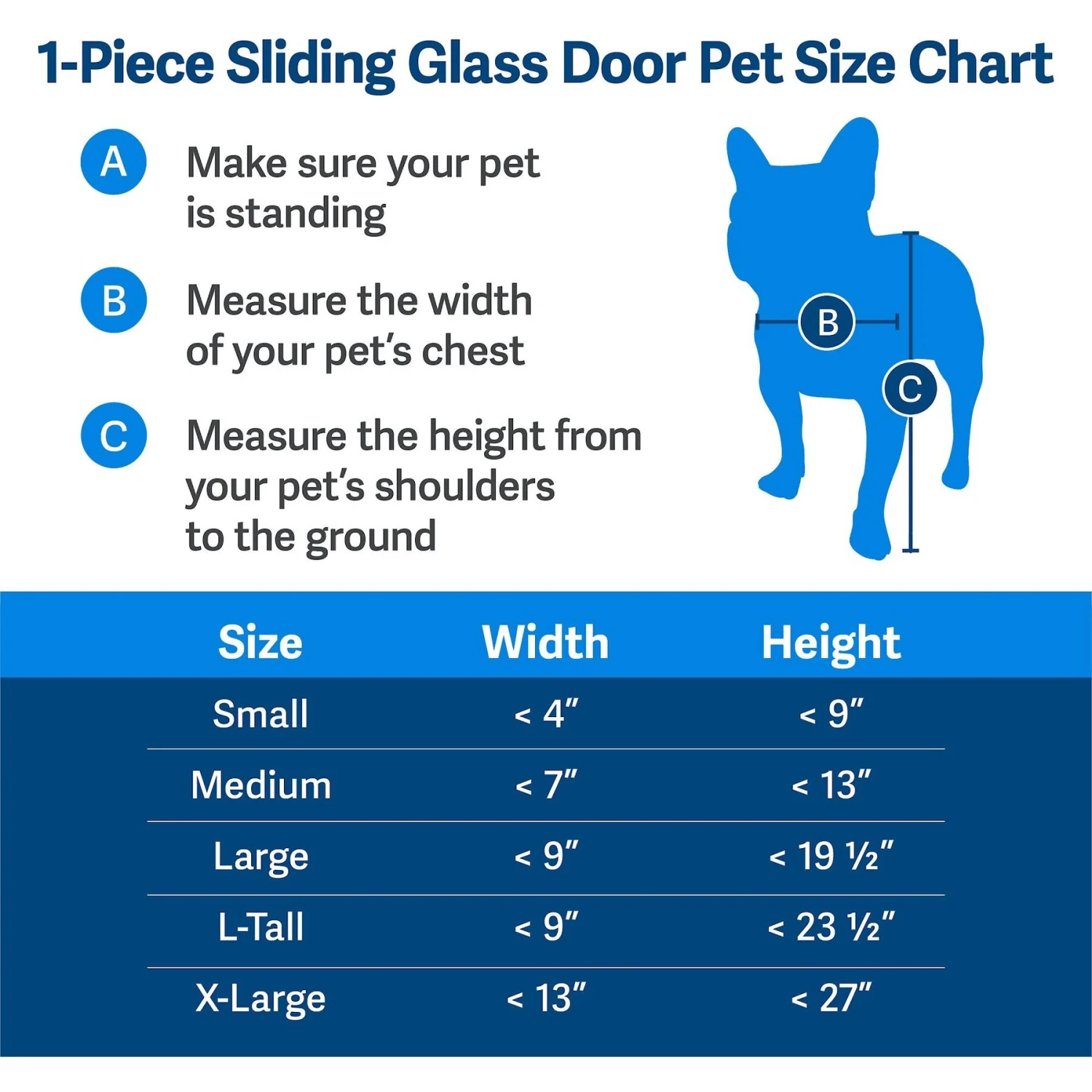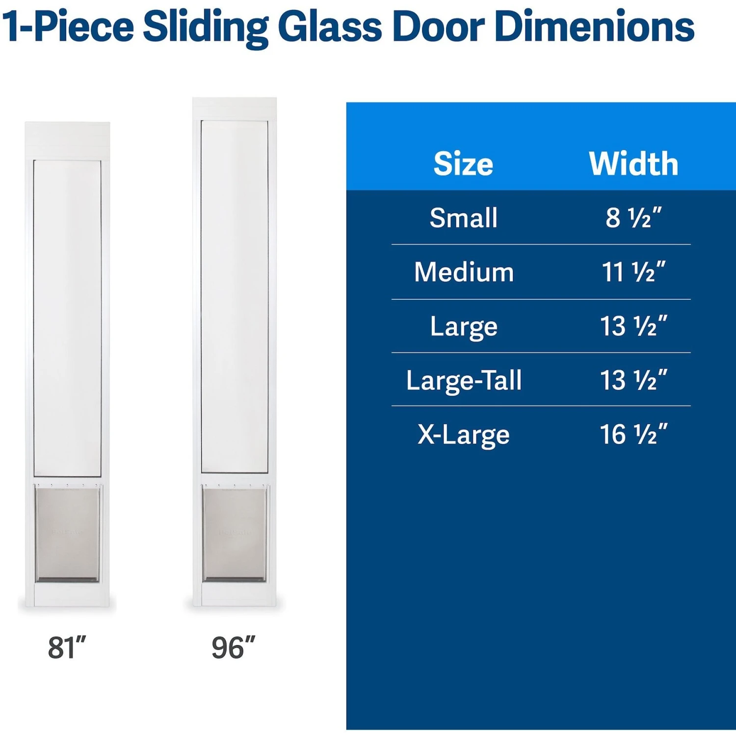 PetSafe Freedom Patio Pet Doors for Sliding Doors allow your pet to come and go as he pleases, through your sliding glass or screen door. These panels feature a heavy-duty aluminum construction and shatter-resistant, tempered safety glass. They’re also equipped with the energy-conserving UltraSeal flexible flap system designed to keep the heat and cold outdoors. Installation is easy, with no cutting required. Simply slide the panel into one end of your sliding door track, secure it to the frame, and add the weather stripping. Open and close the other side of your door easily. And if you ever need to move, you can easily remove the panel from the frame and take it with you. Fits left or right sliding glass doors, 76 13/16 to 81 inches tall. Does not fit recessed sliding glass doors without additional hardware.