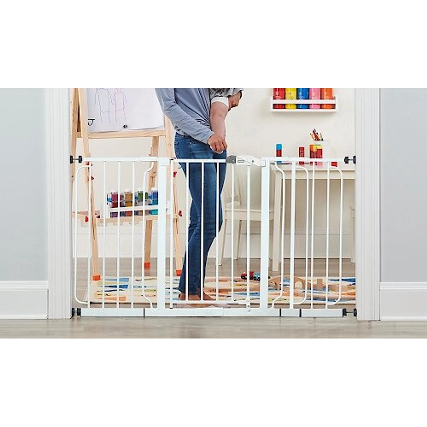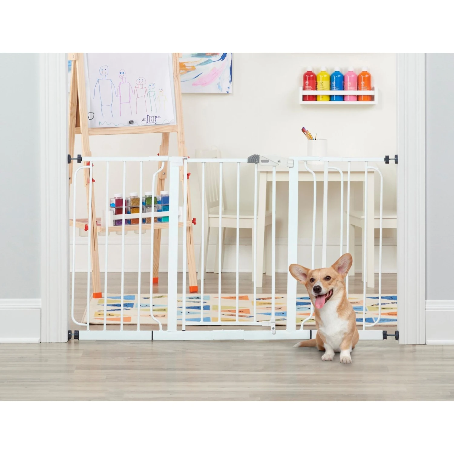 Keep your furry friend safe and sound with the Regalo Extra Wide Walk-Through Gate. Made with all-steel construction, it measures 30 inches in height and expands to fit openings between 29 and 56 inches with included 4, 8 and 12-inch extensions. This gate pressure mounts for easy installation and comes with hardware to mount to your wall for more stability. It also features a convenient walk-through design with a one-touch release safety lock so you can get by but your paw-tner cannot. Ideal for medium to large dogs, Regalo Extra Wide Walk-Through Gate will keep your companion contained.