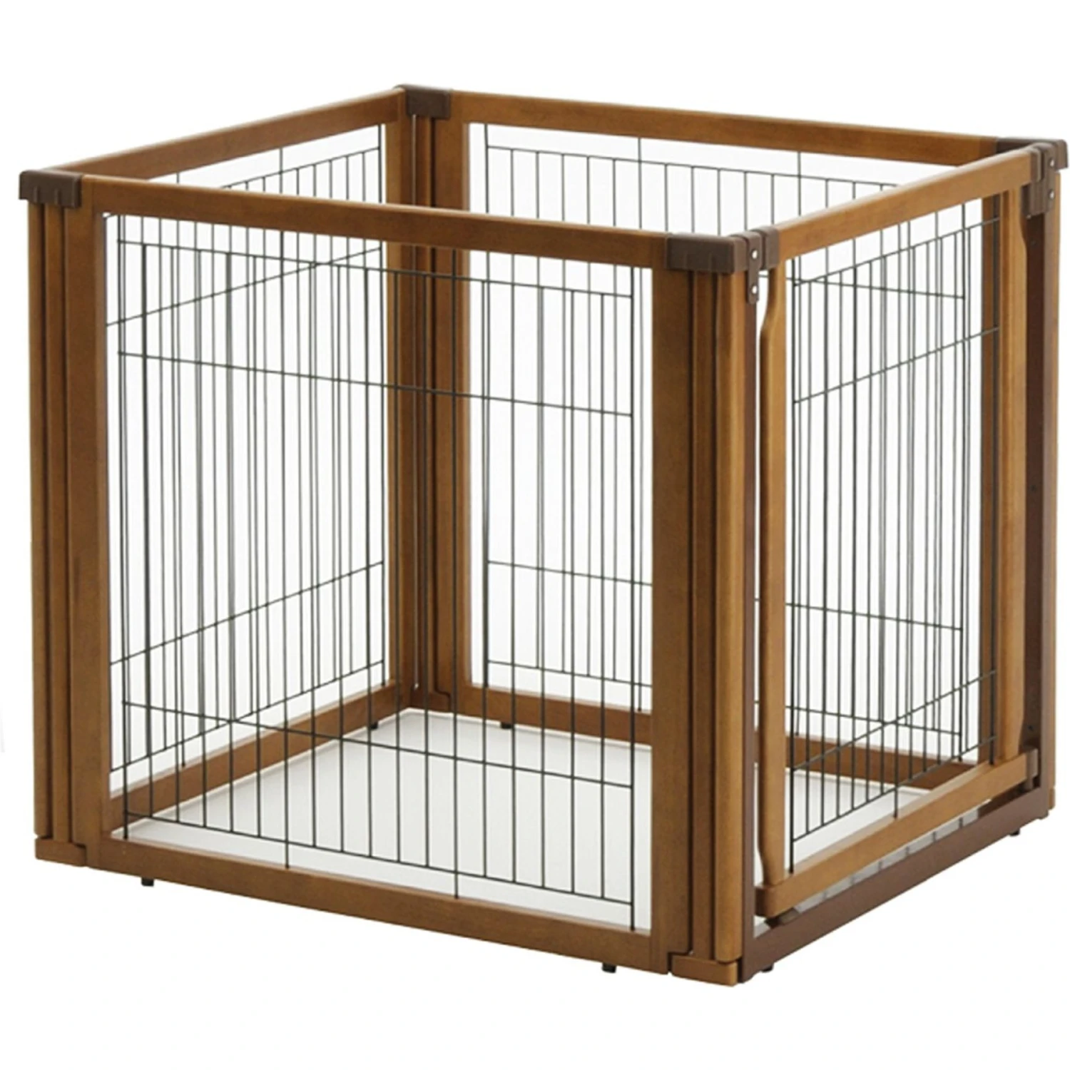 The luxury of three pet products in one: the award-winning Convertible Elite Pet Gate converts quickly and easily from a free standing pet gate – to a room divider – to a pet pen! It’s specifically designed to confine your pet safely in areas with larger openings, yet fit beautifully in any home décor! The gate includes a lockable door that allows you to move freely from room to room without having to shuffle the entire unit. Each panel locks in place at 90 and 180 degree angles using a specially designed cap, which also provides extra stability. In addition, optional panels allow you to configure the gate, divider and pen any way you want and as large as you want! DO NOT move panels while caps are on to avoid product damage. The gate’s beautiful hardwood construction complements Richell’s other fine wood pet products. The Option Panel and Wire Top are sold separately.