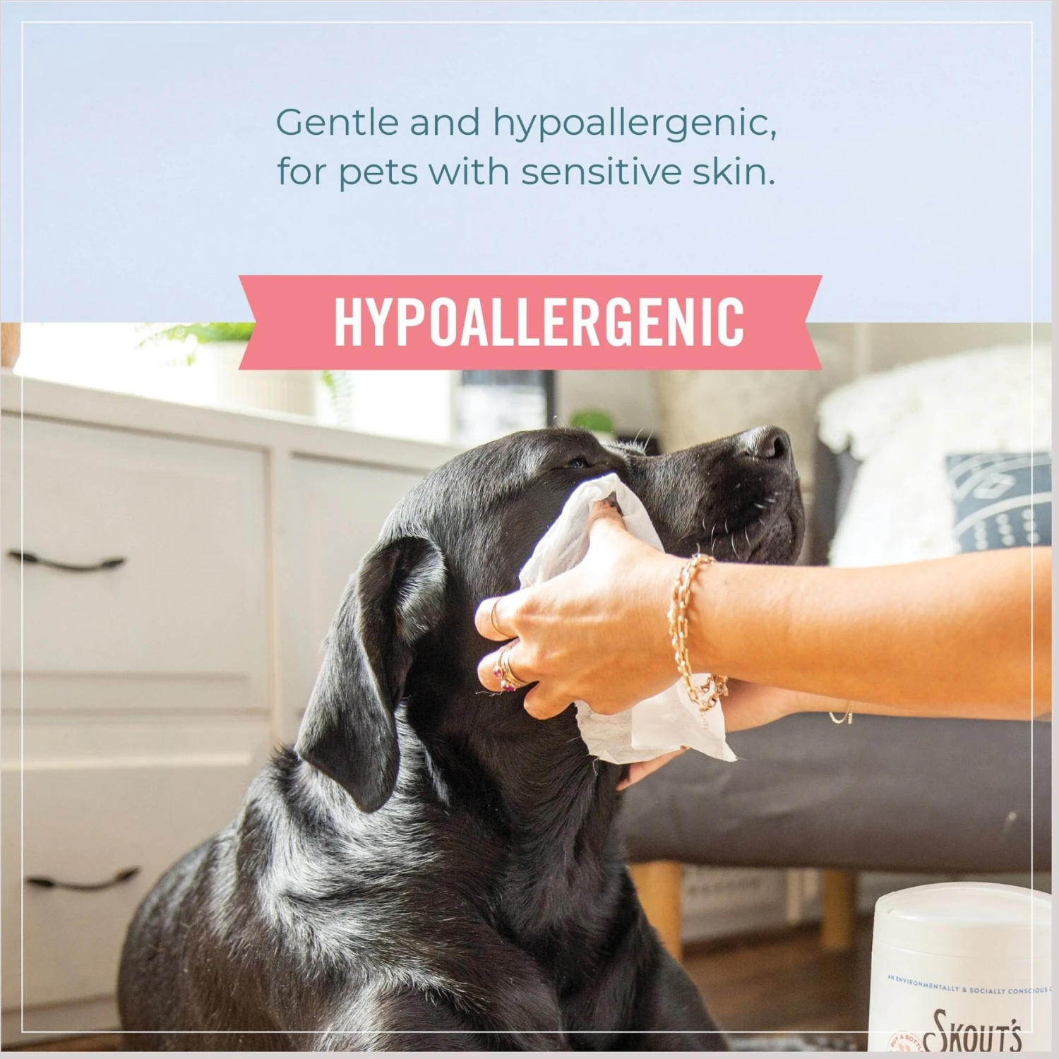 Skout’s Honor Dog, Cat & Small Pet Grooming Wipes, 80 count—Your pet pooch, kitty or small pet will look good and smell fur-esh with Skout’s Honor Dog, Cat and Small Pet Grooming Wipes! They gently cleanse and deodorize your furry friend’s skin and coat. Designed to clean all the hard-to-reach places, these paw-some wipes help you easily remove dirt, dander and pet odors from your fur-iend’s face, paws, skin folds and bum. You’ll love that they’re paraben, sulfate, alcohol and residue-free, and hypoallergenic. Your pet pal will love that she’ll be clean and fur-esh… Skout’s Honor. With every bottle purchased, you’ll help feed a rescue animal in need for a whole day!