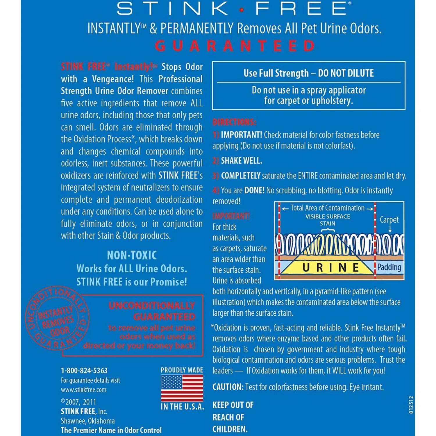 Give urine odors the boot with Stink Free Pet Urine & Odor Remover. This innovative formula completely obliterates odors—even those that only pets can smell! It uses an oxidation process to break down and change chemical compounds, rendering them inert and odorless for your olfactory pleasure. An integrated system of neutralizers adds an extra step of deodorization to neutralize even the most pungent of smells permanently. Simply apply it and let it dry, no scrubbing or blotting required!