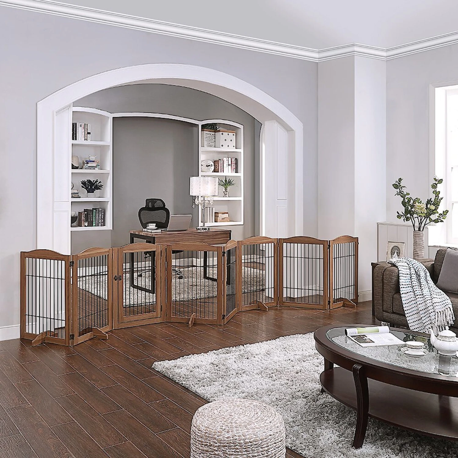 - This 2-panel dog gate can be used on its own for smaller spaces.