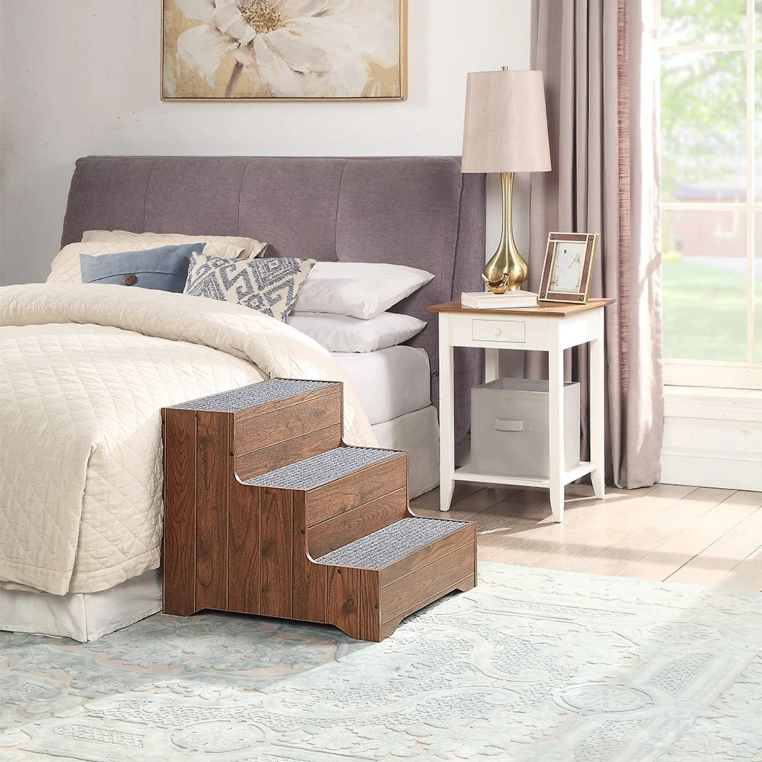 Your furbaby has important places to be—help him get there comfortably with the Unipaws Wooden Three-Story Dog Ladder! With a weight capacity of 125 pounds, these durable stairs can help your pal reach their favorite places fast. The thoughtful design helps reduce the physical impact of jumping, so it’s paw-fect for small, elderly, injured or arthritic pets. A wooden exterior easily complements most home decor. Plus, the steps feature a soft carpet that helps your friend get a good, confident grip.